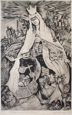 The artwork by Lea Grundig portrays the misery and suffering of people under the leadership of blinded clergy and generals. Grundig’s depiction likely conveys a sense of oppression, highlighting the struggles faced by the general populace under the leadership of authoritative and, in her portrayal, misguided figures. The image becomes a visual narrative that prompts reflection on the consequences of such leadership on the human experience, emphasizing the artist’s commitment to addressing societal issues through her work.