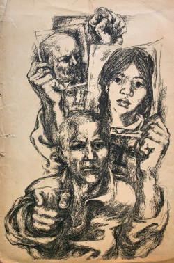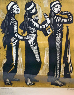 Noteworthy in the exhibition are the works by Gerhard Bondzin, particularly those created during a visit to Vietnam. One of these pieces depicts Vietnamese women dancing beside a machine gun, offering a poignant commentary on the juxtaposition of beauty and conflict. This powerful imagery serves as a symbolic reflection on the complex socio-political landscape of Vietnam during that period, capturing the tension and resilience of its people.